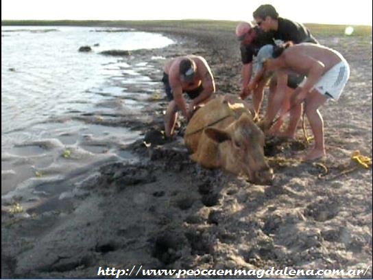Los pescadores trabajando para rescatar una vaca empantanada